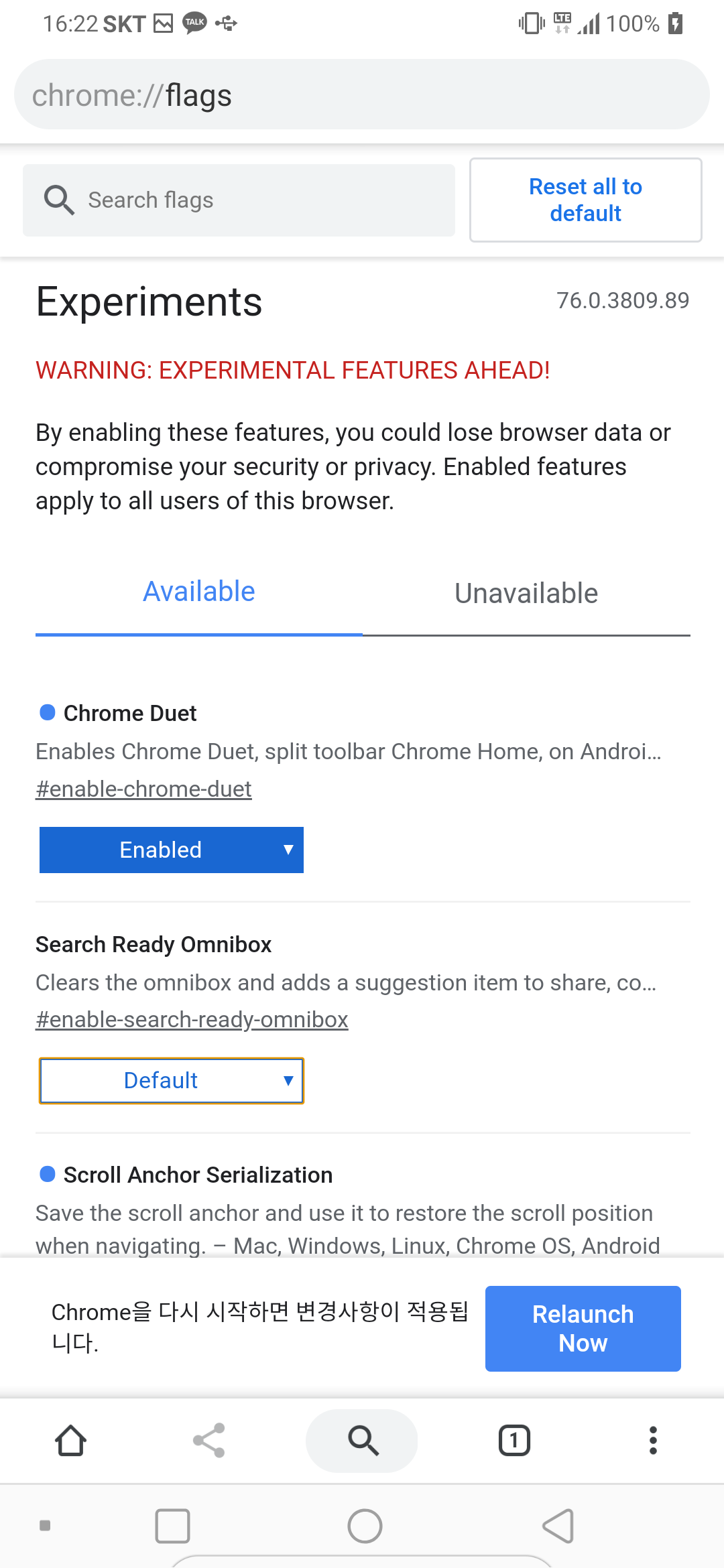 변경 하고 나면 하단 우측에 Relaunch Now 라는 버튼이 생깁니다.